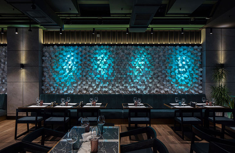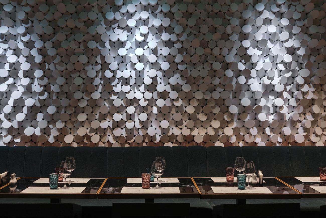 We deliberately chose a soft cycle shape and created a wall of small cylinders of different depths and lengths, cut at the same angle, though installed in different directions. Here, the essential factor is the light: we managed to get a spectacular play of light and shadow, a creative image that differs from various angles”.