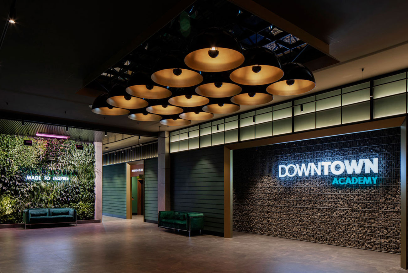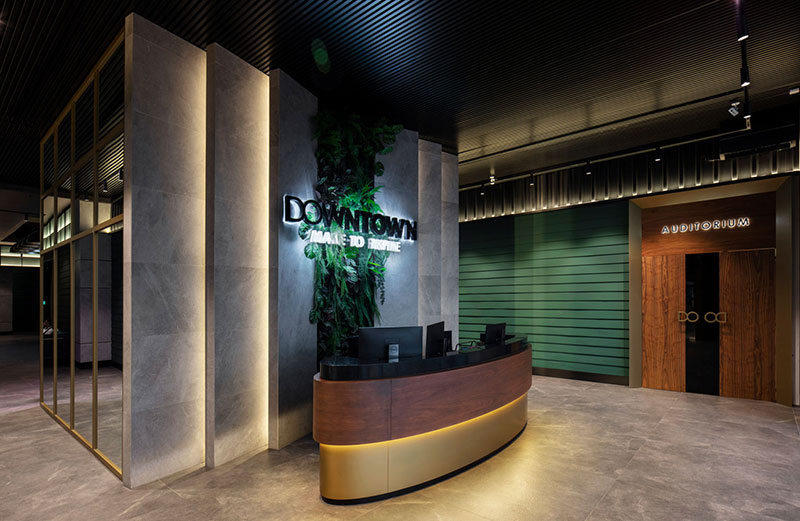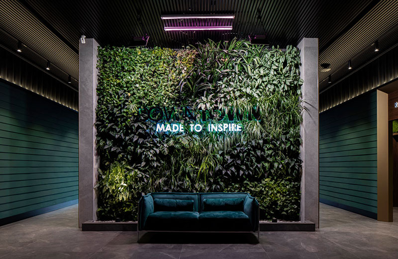 The selfie wall is just behind the reception, decorated with natural plants and neon lights with a slogan “Downtown – made to inspire.” In front is a green velvet sofa.