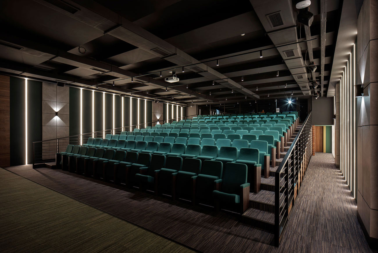 Guests enter the space with a massive reception desk, on the left side of which is a children’s room, on the right, the Auditorium. Here the conferences, lectures, screenings can be held.