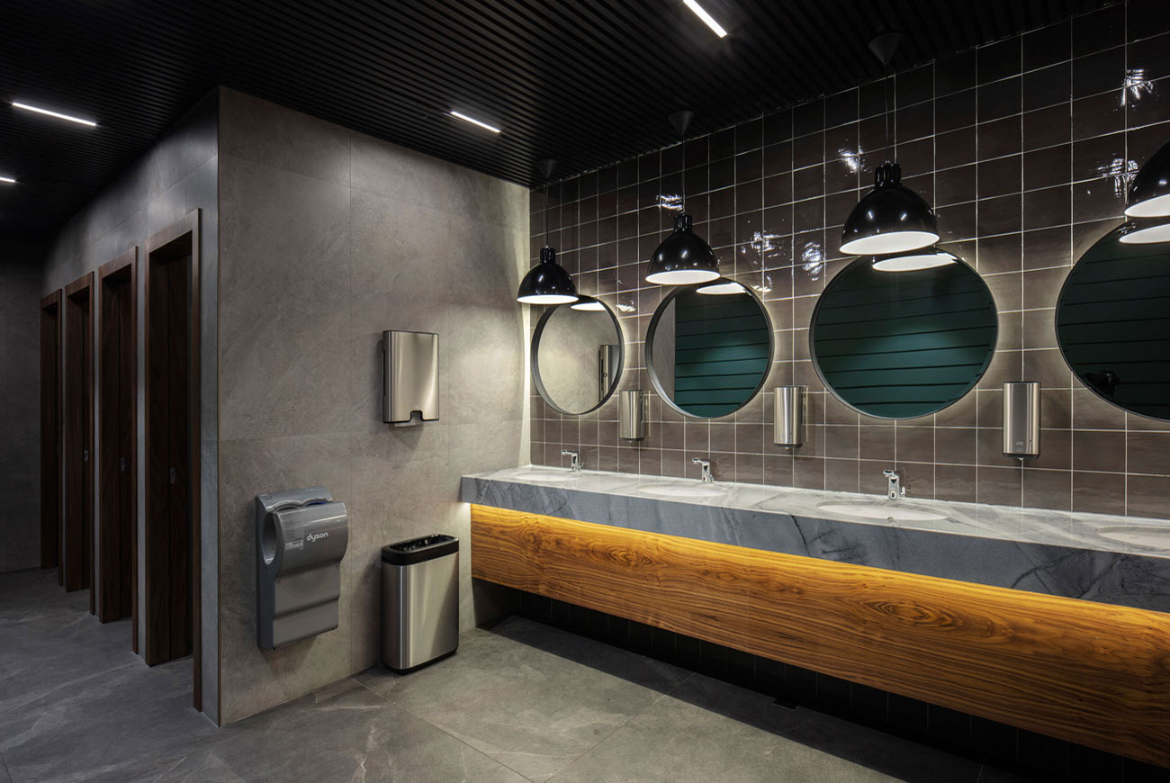 Downtown begins with a “cafe,” where the potted plants serve as an element of zoning. The seats are all the same green velvet, and the tabletops are of natural stone. The toilet is arranged with the same materials as the main hall: a green wooden wall, big lamps, and natural stone washbasins.