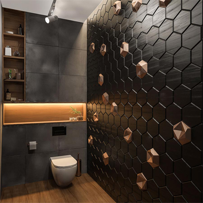 Idea 4: Well, let’s imagine loft style bathroom. Of course here we don’t have variety of choice of bath accessories, but, instead, we have options for wall decorations. Here we provide you hexagon 3D slabs to have different compositions suited in loft style interior design. The model beautifully suits with concrete walls and ceilings. And we can take advantage of colour diversity. Below presented a way of composition.